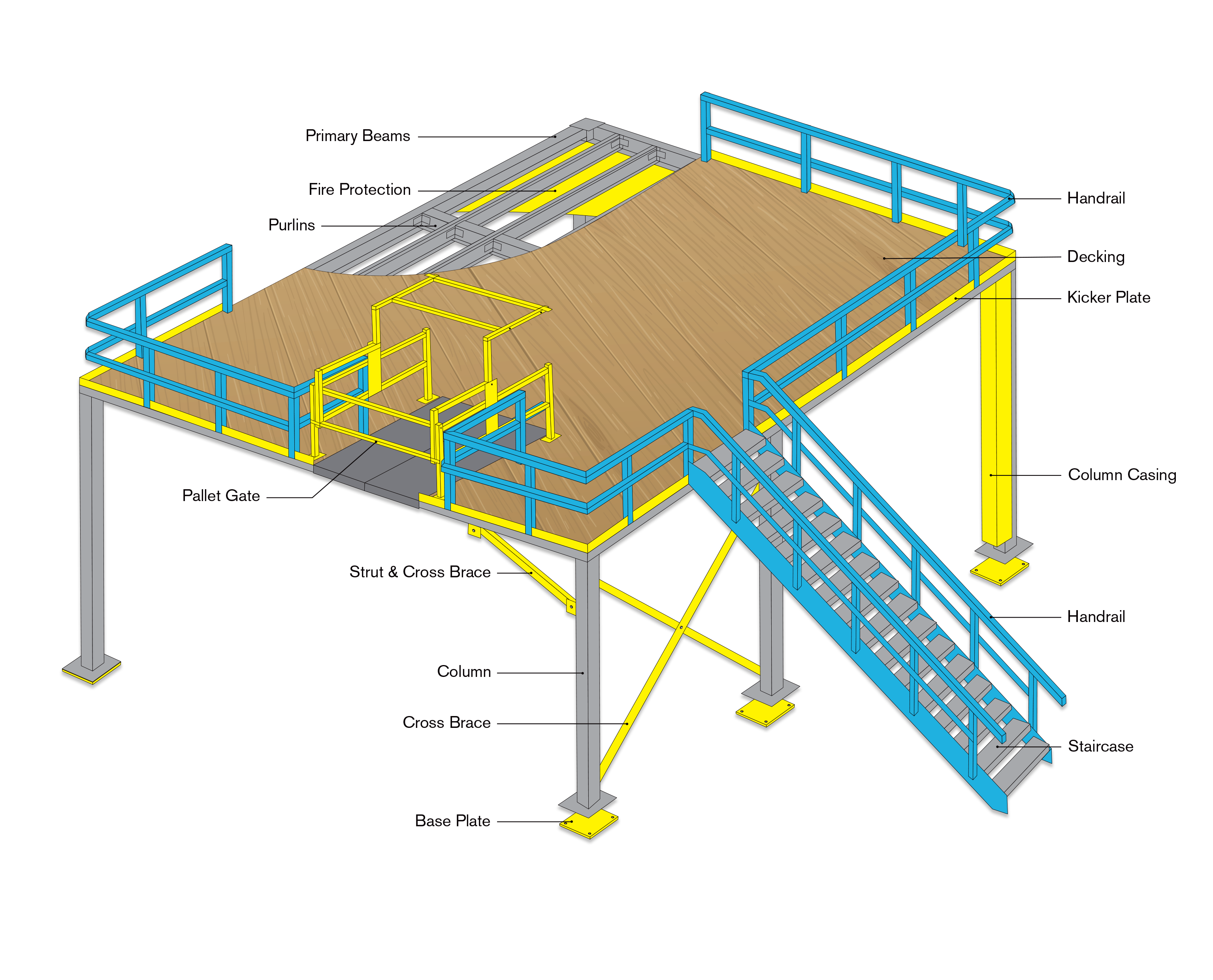 These areas can be supported by a structural steel system comprising of steel columns, I-beams and joists. A good economic alternative to a structural steel supported mezzanine floor is a mezzanine floor supported by steel shelving or racking.