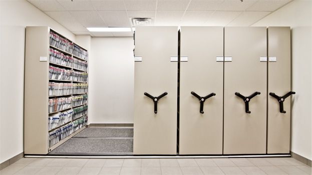 Mobile shelving units provide a space-saving storage solution that enables better utilization of office space to obtain twice the storage of documents and files in an existing area. Opening and closing the compactable shelves is easy to do with controls that facilitate aisle movement. Using a push-button or turn handle, you can eliminate wasted space and store more in a footprint half the size to improve efficiency.